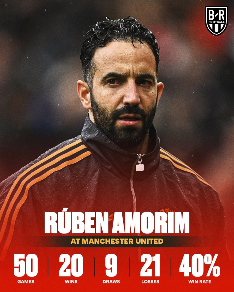10月5日讯 英超第7轮,曼联主场2比0击败桑德兰。这是阿莫林执教曼联的第50场比赛,同时也是执教曼联的第20场胜利。美媒B/R Football晒出海报,海报中罗列出阿莫林执教曼联以来的战绩:50场比赛,20胜9平21负,胜率40%。